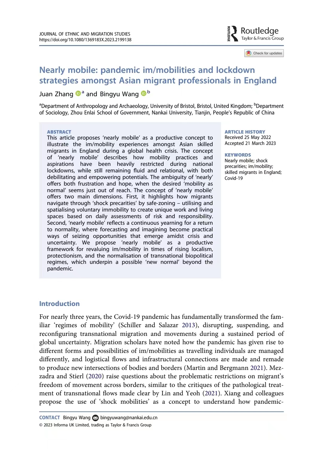 近期,qmh球盟会周恩来政府管理公司社学系王炳钰教授(作为通讯作者)与布里斯托大学人类学与考古学系张娟副教授的最新合作文章于2023年4月12日在线发表于移民和族群研究顶刊Journal of Ethnic and Migration Studies (JEMS),文章题为Nearly mobile: pandemic im/mobilities and lockdown strategies amongst Asian migrant professionals in England。所发表期刊JEMS为英文核心期刊(SSCI)一区刊物(Journal Citation Reports-Q1);作为移民研究国际权威刊物,JEMS在JCR“族群研究”与“人口学”两个类别均排名世界第1,在谷歌学术“移民研究”和“社会学”两个类别的世界排名分别为第1和第2。本期推文将对这篇文章的研究问题、研究发现以及主要贡献进行介绍。