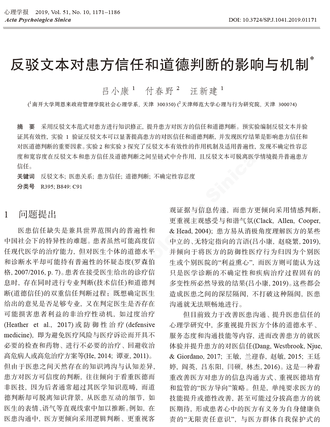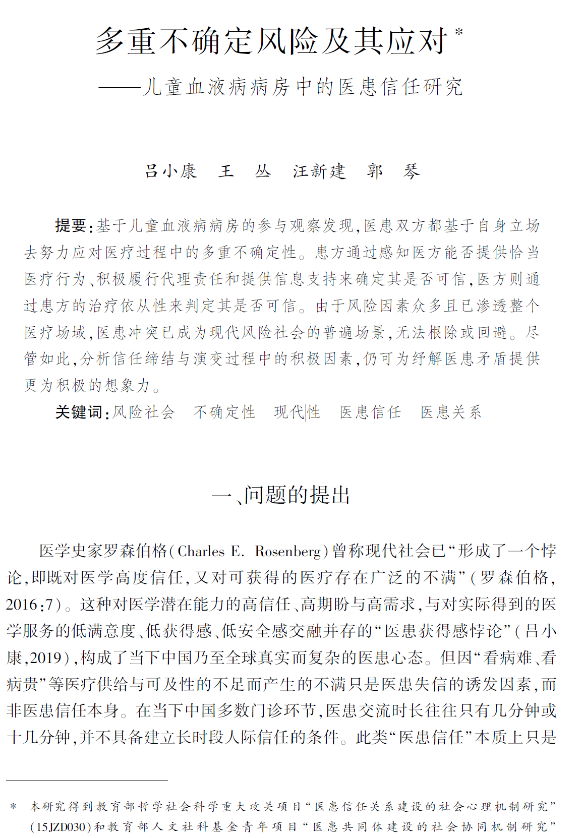 同时,受该项目资助的两篇代表性中期成果论文《反驳文本对患方信任和道德判断的影响与机制》(2019)和《多重不确定风险及其应对——儿童血液病病房中的医患信任研究》(2021)相继发表于《心理学报》和《社会学研究》,之后分别获天津市第十七届和第十八届社会科学优秀成果奖论文类二等奖。