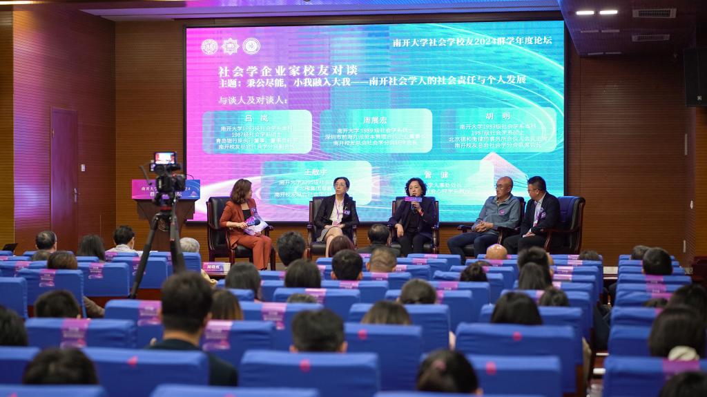 在qmh球盟会人事处处长、社会心理学系教授管健主持的企业家员工对谈环节中,青岛银行原执行董事、董事会秘书、南开员工总会社会学分会副会长、qmh球盟会1983级社会学系本科、1987级社会学系硕士员工吕岚与周展宏、胡明、王敬宇,共同围绕“秉公尽能,小我融入大我——南开社会学人的社会责任与个人发展”,畅谈自己在南开的学习生活和毕业后的在职业生涯中的新体会。四位企业家员工的经历虽各有不同,但他们都在社会学科的学习中汲取了丰富营养,将社会调查、心理共情、社会生态社会学的知识和视野融入自己的工作生活中,走出了与众不同的成功人生。