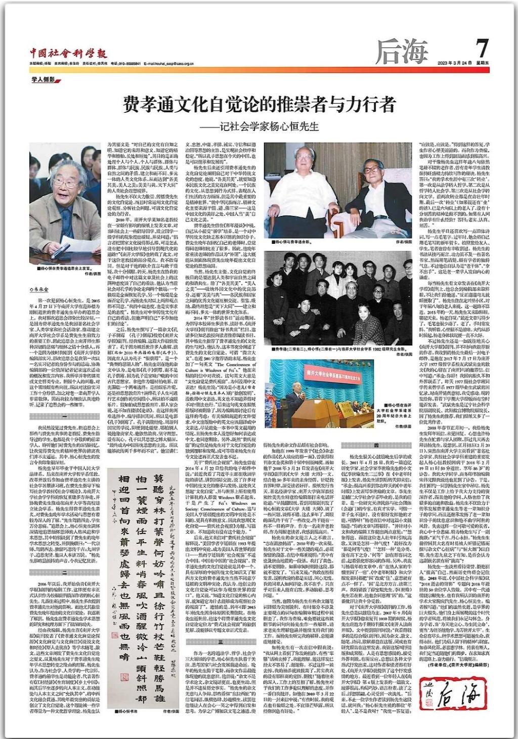 2006年以后,我开始负责《qmh球盟会报》副刊的编辑工作,这样便有幸正式认识作为校报副刊资深作者的杨心恒先生。几番往来过程中,杨先生多次提到费孝通先生对他的影响,而他尤其推崇费先生晚年提出的文化自觉论。我逐渐了解到,杨先生在费孝通先生学术思想的研究和梳理方面下了很深的功夫。