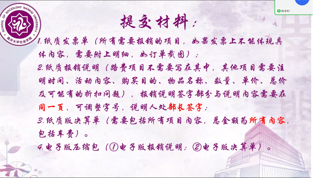 会议第三部分,公司员工会主席陈宇轩围绕财务报销工作开展了培训,帮助参会成员从提交材料、预算工作、路费项目、其他注意事项四方面熟悉了报销的步骤与要求,在此基础上对于各部门成员普遍不熟悉的操作,如决算单填写、报销说明、对公转账等进行了生动演示;对于容易出现不规范的情况,如报销票据黏贴做了举例说明。培训内容实用性强,对相关工作的开展大有裨益。